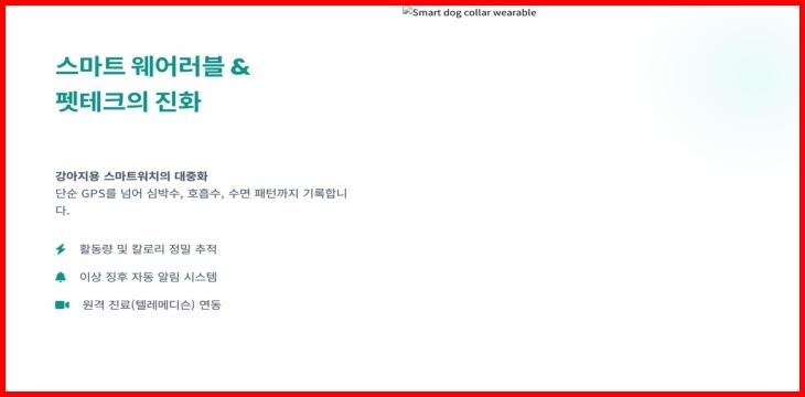 - 텔레메디슨(원격 진료) 연동: 웨어러블 데이터와 함께 영상통화를 통해 수의사가 상담·예비 진단을 제공하는 ‘원격 케어’도 성장세입니다.