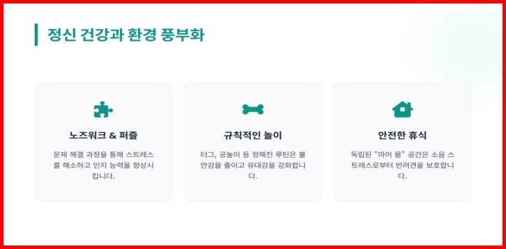- 퍼즐 토이·노즈워크: 사료를 쉽게 주기보다, 후각을 쓰고 문제를 해결해야 먹을 수 있는 장난감이 스트레스 해소와 인지능력 향상에 도움을 줍니다.