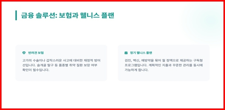 보험 약관은 보장 범위와 면책 사항을 꼼꼼히 확인해야 하며, 특히 유전 질환이나 슬개골 탈구 등 품종별 빈번한 질환의 보장 여부가 중요합니다.