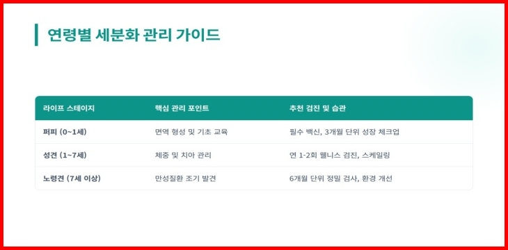 | 노령견 (7세 이상) | 만성질환 조기 발견, 통증 관리 | 6개월마다 혈액·소변·영상검사, 관절·심장·신장 질환 모니터링, 미끄럼 방지 환경. |