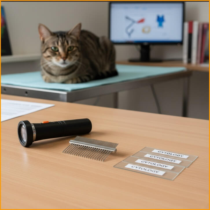 - 가려움·딱지·귀염증·원형탈모가 보이면 곰팡이·세균·진드기 등 감염성 원인을 배제해야 합니다. (피부 스크래핑·진균배양·세포검사 등)
