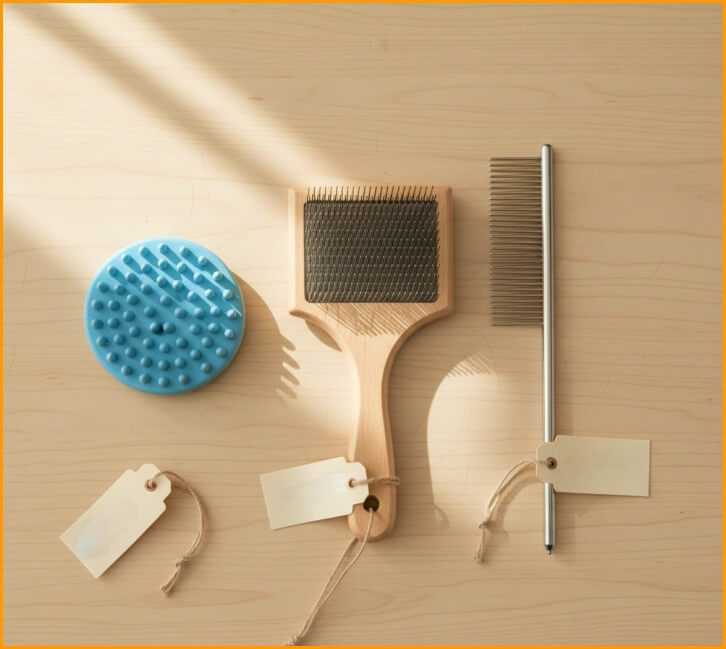 - 도구 선택: 슬리커 브러시(엉킴·죽은 털), 러버 브러시(단모·마사지), 스틸 콤(장모 하부코트). 피부 자극 최소화가 원칙입니다.