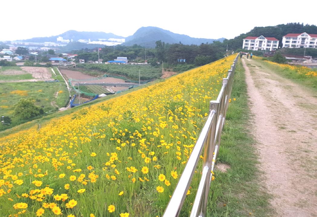 다음은 금계국이 활짝핀 천안에 있는 천흥저수지입니다. 이곳의 저수지는 금계국이 저수지 언덕에 활짝 피면 사진동호회 나 연인 그리고 가족들이 나들이 및 사진을 찍으려고 많이 방문하는 장소입니다.