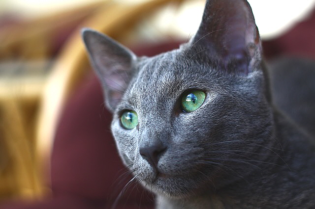 러시안블루의 눈은 크고 아몬드 모양의 녹색눈이 특징입니다. 얼굴은 완벽하게 균형이 잡혀 있으며, 짧은 주둥이와 눈에 잘 띄는 수염이 있는 이상적이 크기입니다.