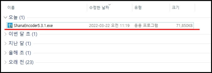 컴퓨터에 다운로드가 완료가 되면 다음과 같이 다운로드 받아진 부분에 ShanaEncoder5.3.1.exe 파일이 다운로드되어 있을 것입니다. 각 버전에 따라서 받아지는 파일명도 틀려질 것 같습니다.