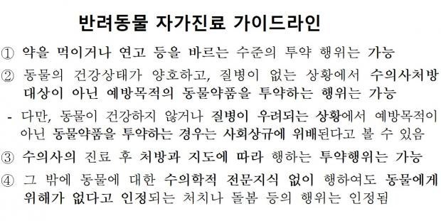 가이드라인은 크게 4가지로 '동물의 건강상태가 양호하고, 질병이 없는 상황에서 수의사 처방대상이 아닌 예방목적의 동물약품을 투약하는 행위. 다만, 동물이 건강하지 않거나 질병이 우려되는 상황에서 예방목적이 아닌 동물약품을 투약하는 경우는 사회상규에 위배'라는 내용이 포함돼 있다.