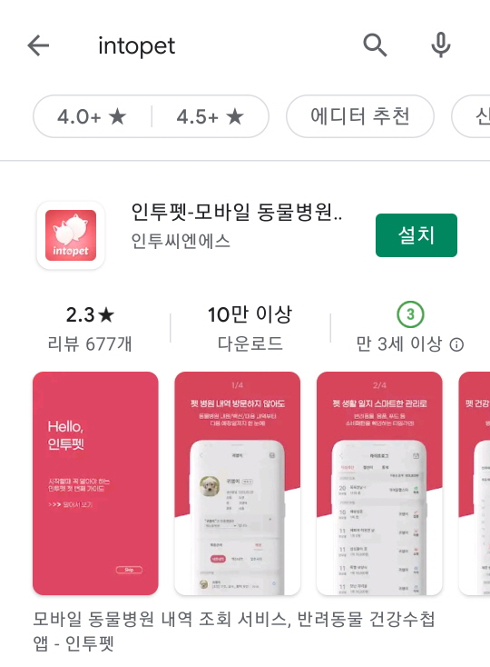 구글 플레이 스토어에 가서 intopet 또는 인투펫 을 검색을 합니다.