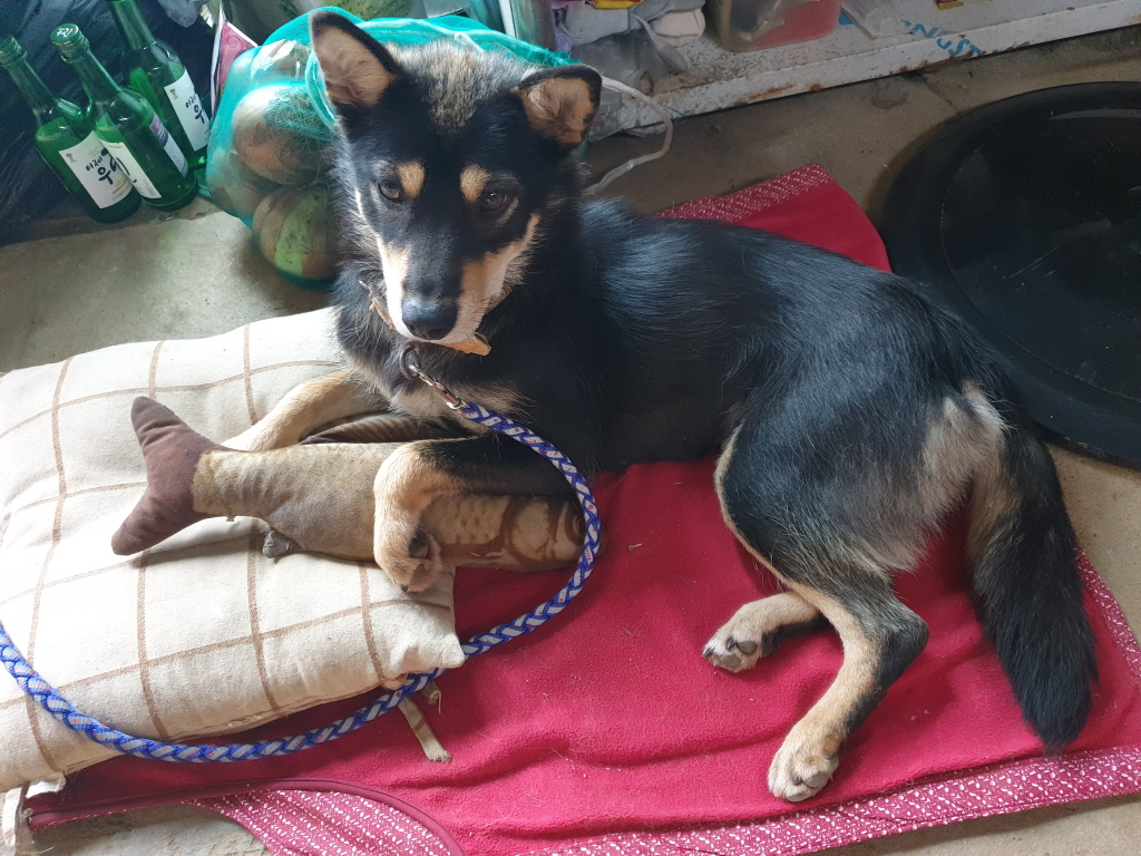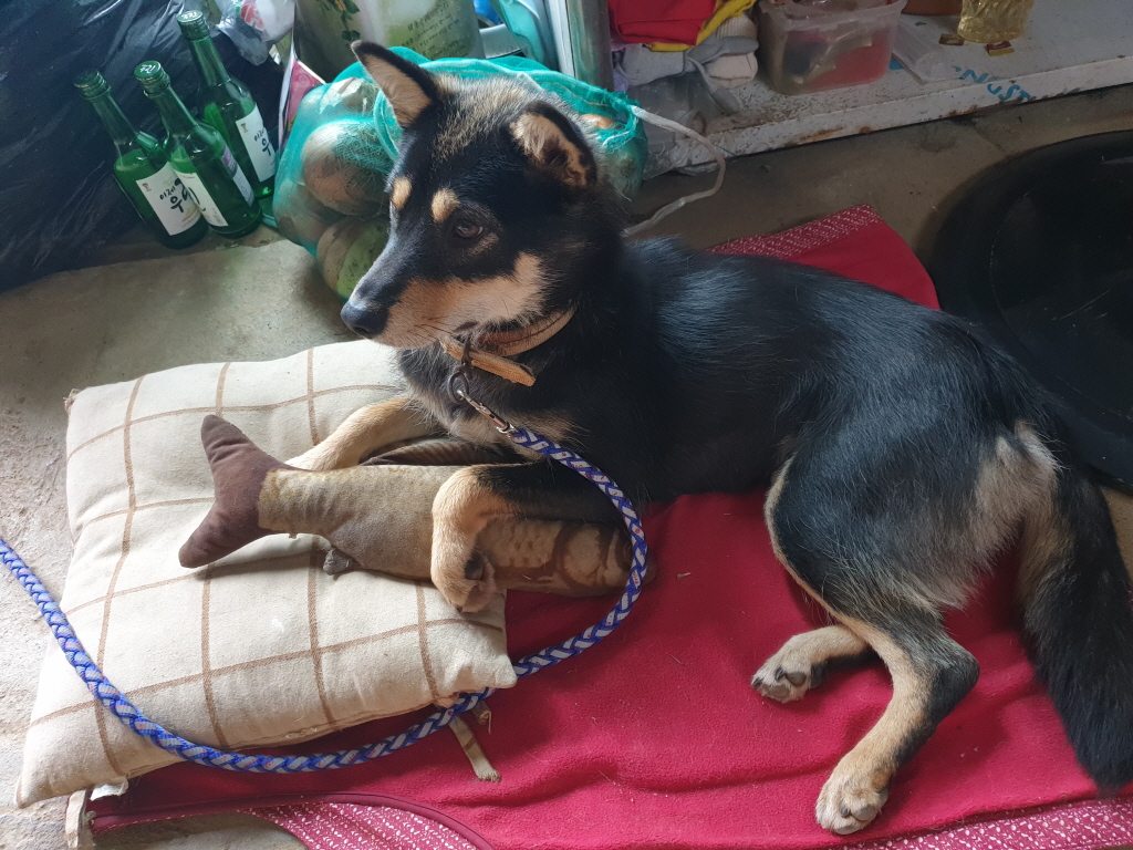 정말로 순진하고 착한 눈을 가지고 있는데, 동네에 있는 닭들을 많이 죽이고, 동네에 있는 밭들의 비닐들을 모두 밟고 다녀서 장인어른에게 목줄이 채워지고, 법정 구속이 되었네요~~~~ 불쌍한 체리....... 동네에서... 말썽장이로 찍혔네요....