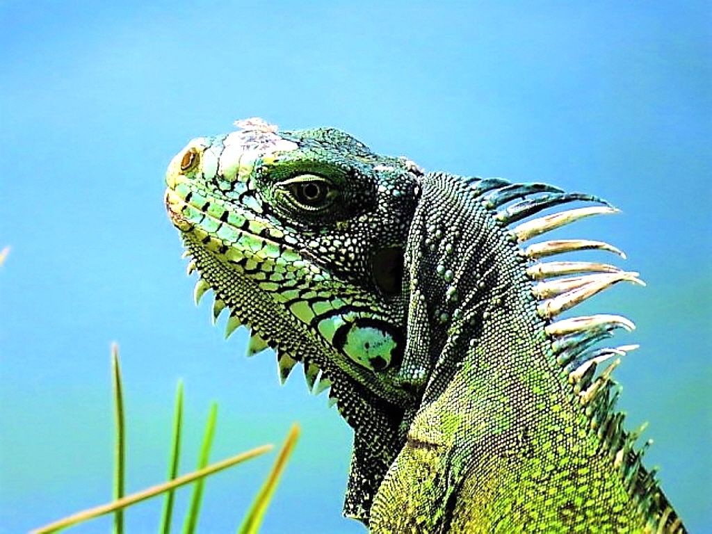 갓 태어난 새끼 이구아나는 사지와 몸통이 연결되는 부위에 수직으로 된 어두운 부분이 있고, 꼬리는 자신보다 큰 동물의 공격을 방어하기 위해 몸길이보다 훨씬 깁니다. 1~1.2m 정도 되는 이구아나의 꼬리의 힘은 정말로 채찍 같은 힘을 발휘합니다.