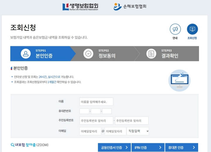 보험소비자는 '내 보험 찾아줌(Zoom)을 통해 인터넷이나 핸드폰으로 본인의 보험정보를 별도의 회원 가입이나 비용 부담 없이 실시간으로 조회할 수 있고, 보험금을 신청할 수 있습니다.
