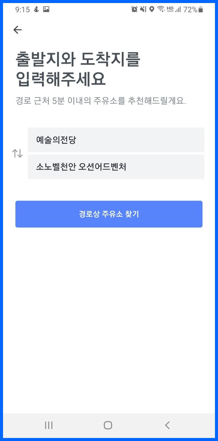 경로상의 주유소를 설정을 할수할 수 있습니다. 출발지와 도착지를 설정하여 검색을 하면 경로상에 싼 주유소를 검색하여 주유를 할 수 있습니다.